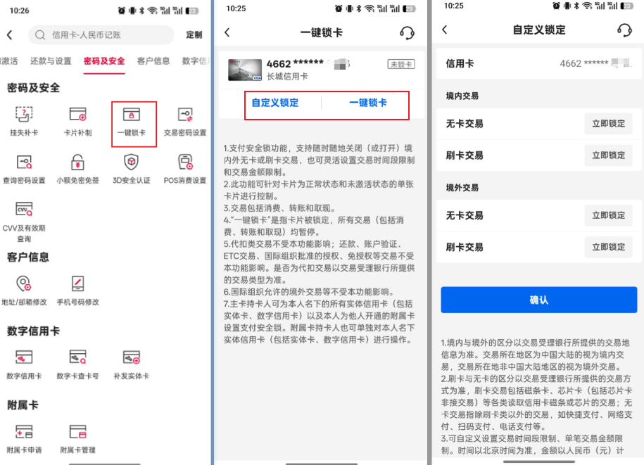 信用卡普遍提供“一键锁卡”功能,这是目前银行防范盗刷最主要、最核心的自助工具。