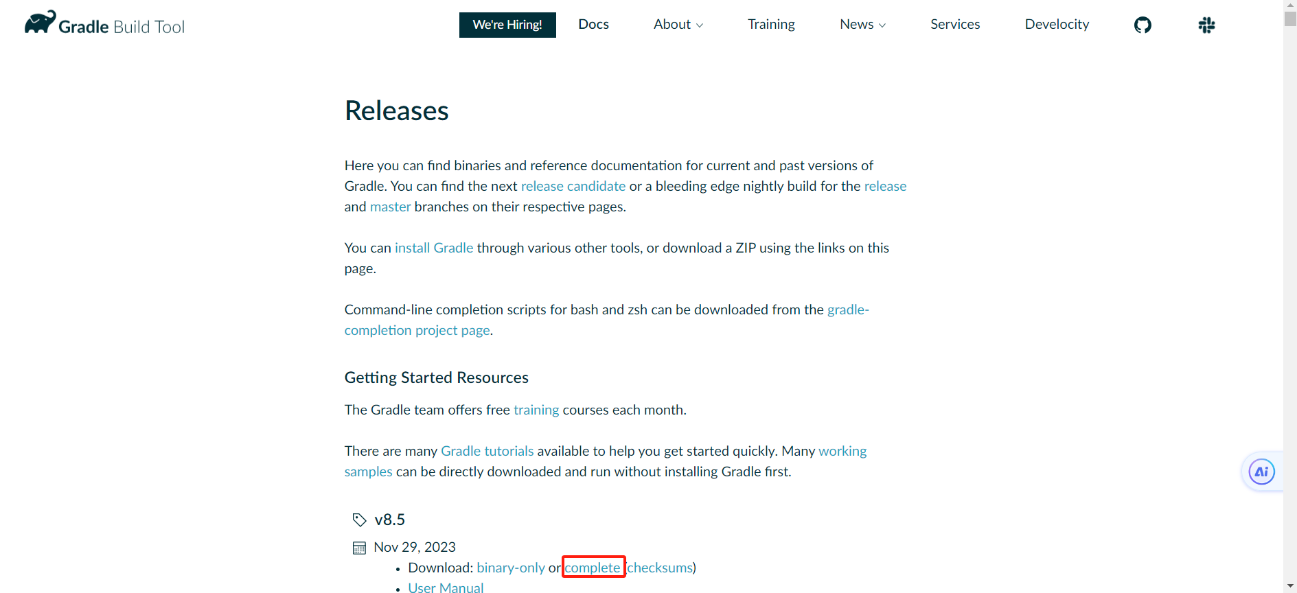 找到最新的版本,如上图,最新版是 v8.5(2023.12) ,找到binary-only,点击下载文件gradle-xx.zip。另一个complete 是完整版本,相比于binary-only 多了src源码 和docs文档 ,如果不是研究源码无需下载。