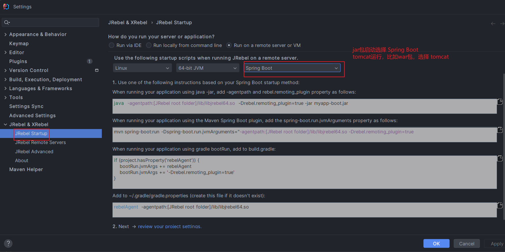 远程服务要热更新代码,需要使用 JRebel 的 Agent 启动应用。服务端要怎么处理,可以参考 Setting | JRebel .. | JRebel Startup。