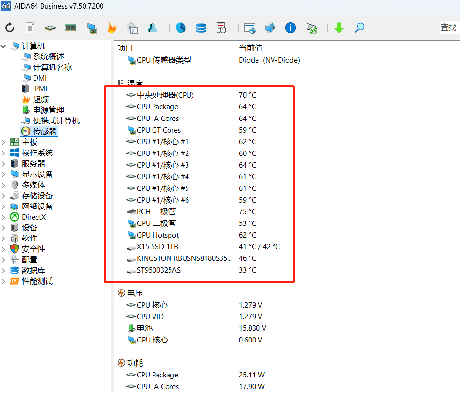 AIDA64 > 计算机 > 传感器(CPU、GPU、硬盘)