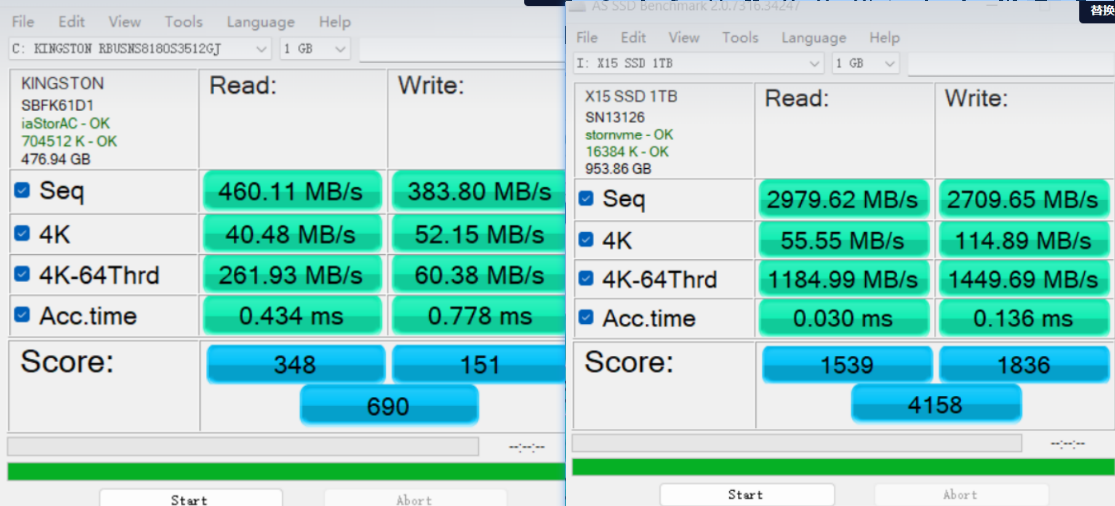 左侧是 SATA3 SSD,右侧是 m.2(nvme协议)PCle 3.0 x4 的 1TB SSD