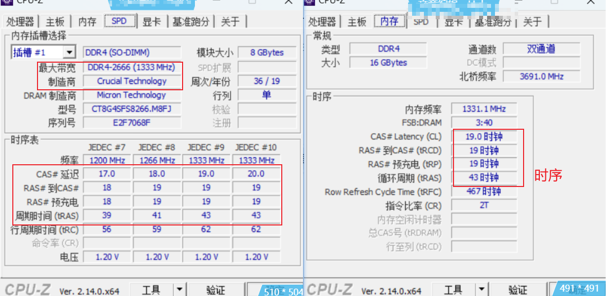 如左图,JEDEC#7、JEDEC#8 是指不同模式,后续显示的是不同模式下的频率和时序。右图,时序是 19-19-19-43。