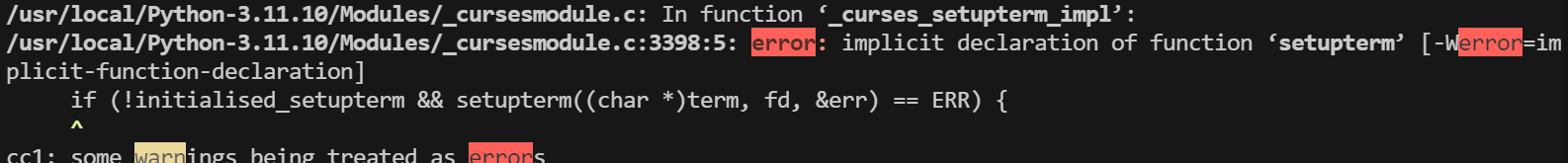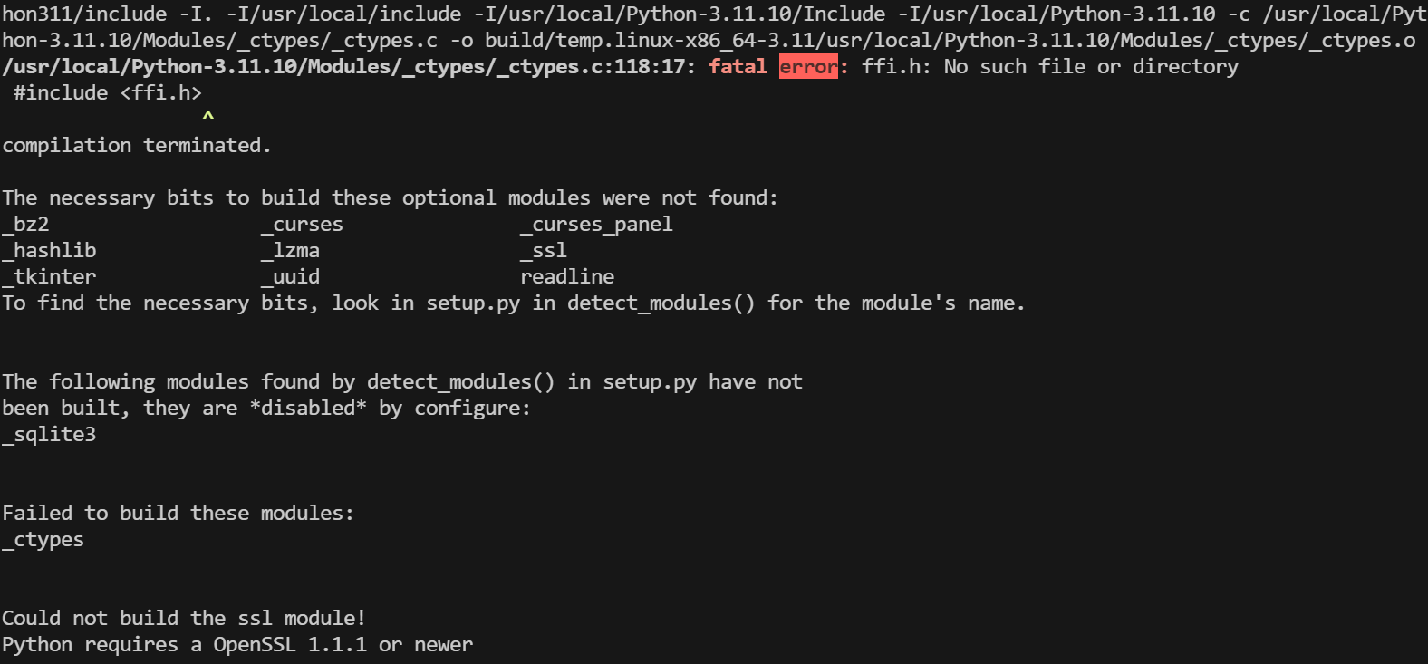 如上图显示,No such file or directory(缺少文件),最终 compilation terminated(终止编译),很多模块也没有编译完成。原因是我 make 之前忘了安装依赖了。这种情况会导致很多功能异常 —— 比如后面会提到的 SSL 模块缺失,pip 下载 https 地址的时候失败。