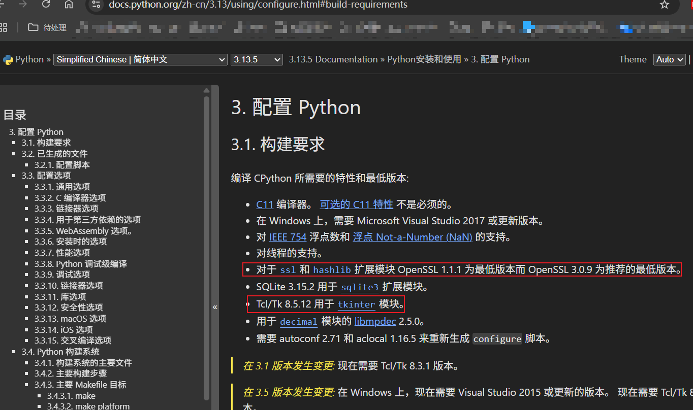 如下图,可以看见编译需要的 openssl、Tcl/tk 版本以及各个编译参数的信息。