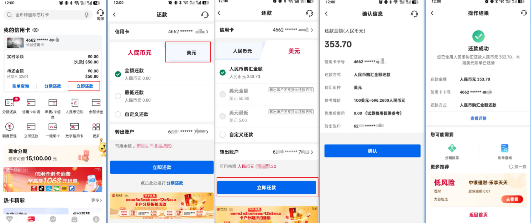 可通过 APP 开通自动还款/自动购汇,也可在 APP 手动购汇还款(操作简便)